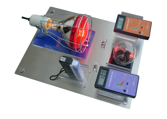 SK4250不銹鋼展示套件專業用于展示太陽膜、隔熱玻璃等透光物質的隔紅外線、隔紫外線效果。采用飛利浦250W紅外光源,紅外燈的高發熱量讓整個展示過程模仿太陽光的照射,讓顧客更好地體驗太陽膜或隔熱玻璃對熱量的阻隔效果,體驗不同檔次太陽膜、隔熱玻璃等產品的性能差異。