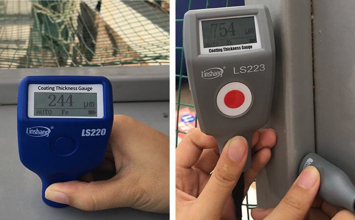 對于一些特殊行業,鋼結構廠房的防腐要求比較高的,比如印染、化工、造紙及沿海建筑等鋼結構廠房,則需要用到更大量程的防腐涂層測厚儀。林上LS223涂鍍層測厚儀的最大量程就可測到5000μm,即5mm。以下為LS223涂層測厚儀配F5N3探頭測試鋼結構防腐涂層厚度的圖片。