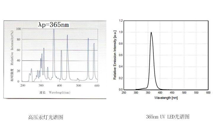 眾所周知,紫外固化用高壓汞燈在我國是有國家標準的,《QBT 2826-2006》膠印紫外光固化油墨國標,該標準中有規定:墨膜紫外固化條件:80W/cm2高壓水銀燈,照射距離15.5cm,速度64m/min。但是固化用的LED燈卻一直沒有出具國家標準,很多企業還是在使用高壓汞燈專用的紫外能量計去測試LED光源,但是這種做法是非常不專業的。因為高壓汞燈和固化用LED燈的光譜曲線圖相差很多(見下圖),所以測試應該使用固化用LED燈專用的紫外能量計。