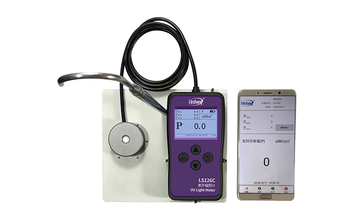 林上科技自主研發生產的LS126C紫外線強度檢測儀,就是專門設計檢測紫外253.7nm殺菌燈強度的儀器。購買儀器即贈送一米的測試掛鉤,確保測量符合國家標準的測試距離。只要需將儀器放在托盤上在掛在燈管下方即可測試,使用十分的方便。LS126C還具有藍牙功能和手機APP,可以通過藍牙連接手機APP就可以在室外實時監控測試數據。