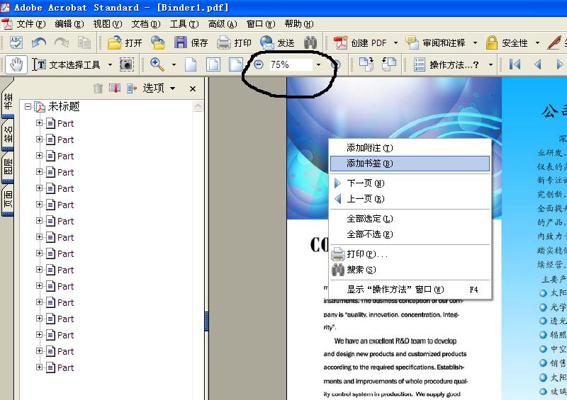 選擇好打開時(shí)需要顯示的圖的大小,如75%,100%等。然后在也需要?jiǎng)?chuàng)建的書簽的頁(yè)面上,擊右鍵,選擇“添加書簽”。需要添加的頁(yè)面,就會(huì)在左側(cè)顯示,然后在左側(cè),修改需要顯示的書簽名字。