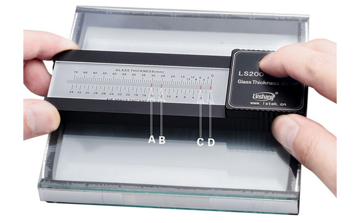把玻璃測厚儀放置于中空玻璃的表面,按下電源開關并且保持不放,可見四條光線,其中D光條出廠時已經(jīng)校準和零刻度線平齊,C光條在“玻璃厚度標尺(GLASS THICKNESS)”上的讀數(shù)即為第一層玻璃的厚度。在“玻璃厚度標尺”A光條的讀數(shù)減去B光條的讀數(shù)即為第二層玻璃的厚度,A = 30mm,B = 25mm,C = 5mm,D = 0mm。第一層玻璃的厚度為C – D = 5mm,第二層玻璃厚度為A - B = 5mm。